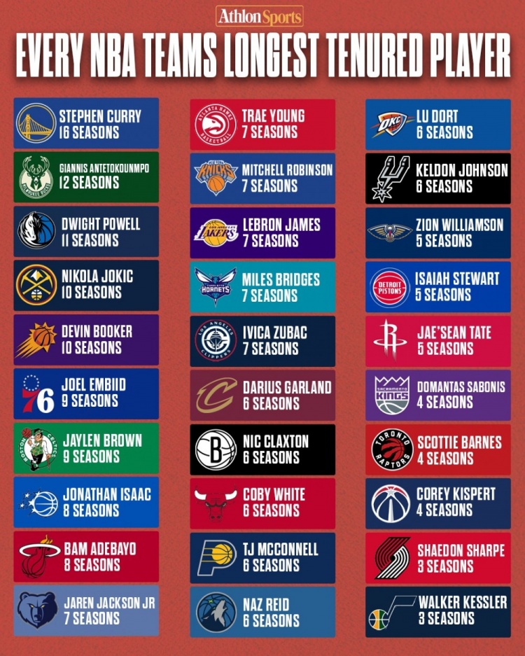 7月5日讯 每支NBA球队都有那么一位“最熟悉的面孔”。榜单统计了目前每支球队效力时间最长的球员,其中库里已经为勇士征战16个赛季排在第一,字母哥为雄鹿征战了12个赛季排在第二。以下为详细排名: